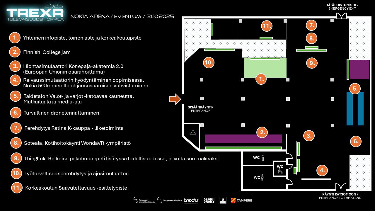 Tampereen korkeakouluyhteisö TUNI, Tampereen seudun ammattiopisto Tredu ja Tampereen kaupunki sekä Valkeakosken ammattiopisto VAAO ja SASKY koulutuskuntayhtymä järjestävät neljännen TreXR-tapahtuman Nokia Arenan Paidia- ja Eventum-tiloissa 31.10.2025.