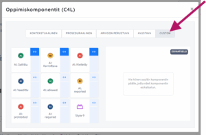 Legopalikalta näyttävästä kuvakkeesta aukeaa ponnahdusikkuna, josta valitaan Custom-välilehti. Sen sisällä on neljä eri väristä palleroa suomeksi ja englanniksi valmiina kuvaamaan tehtävän luonnetta.