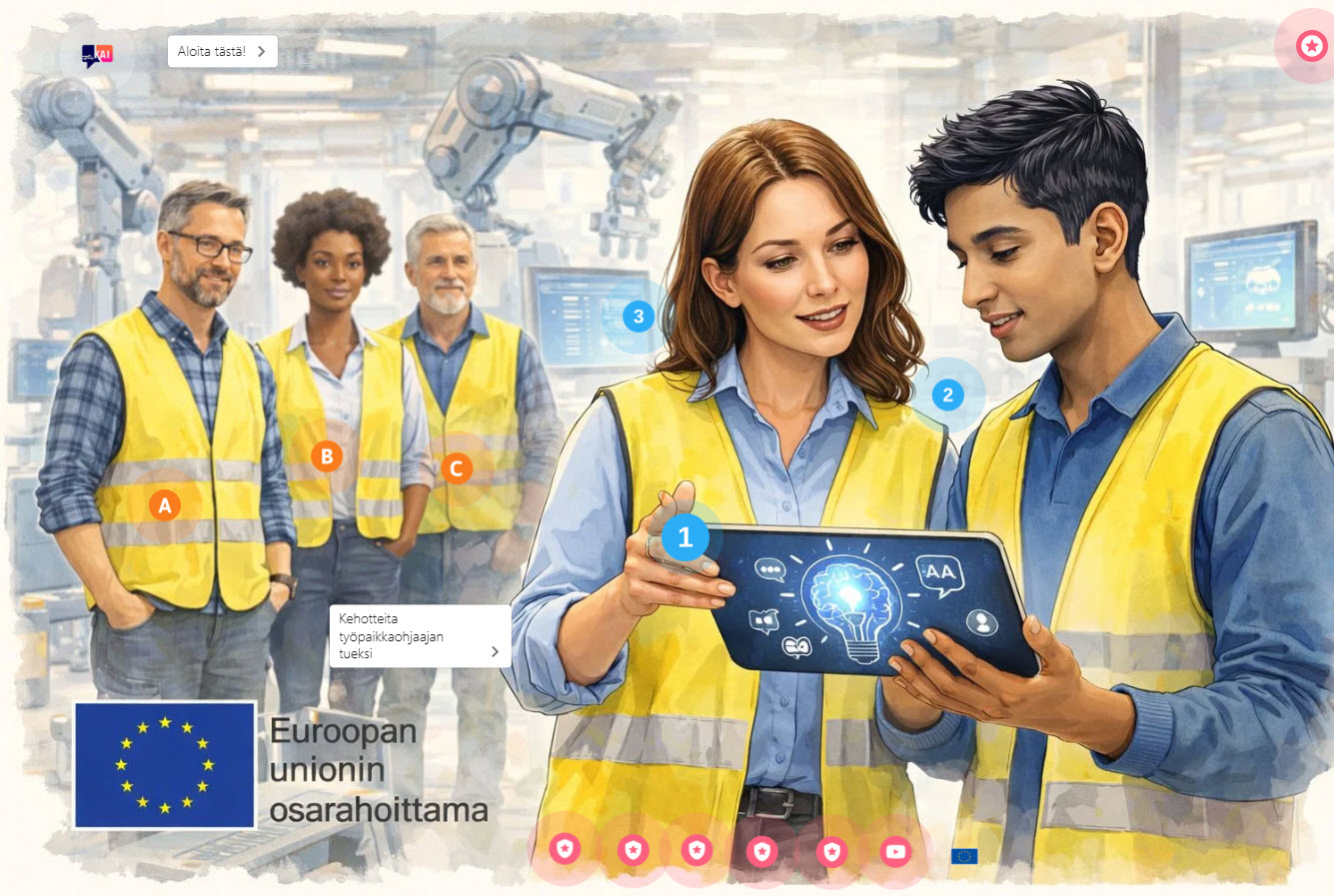 KAI-hankkeessa on koottu erilaisia apuvälineitä (ns. “kielimuurinmurtajia”) ThingLink-pohjaan työpaikkaohjauksen helpottamiseksi. Mukana on keskeisiä sisältöjä sekä kielitietoisesta ohjaamisesta että tekoälyn käyttämisestä.